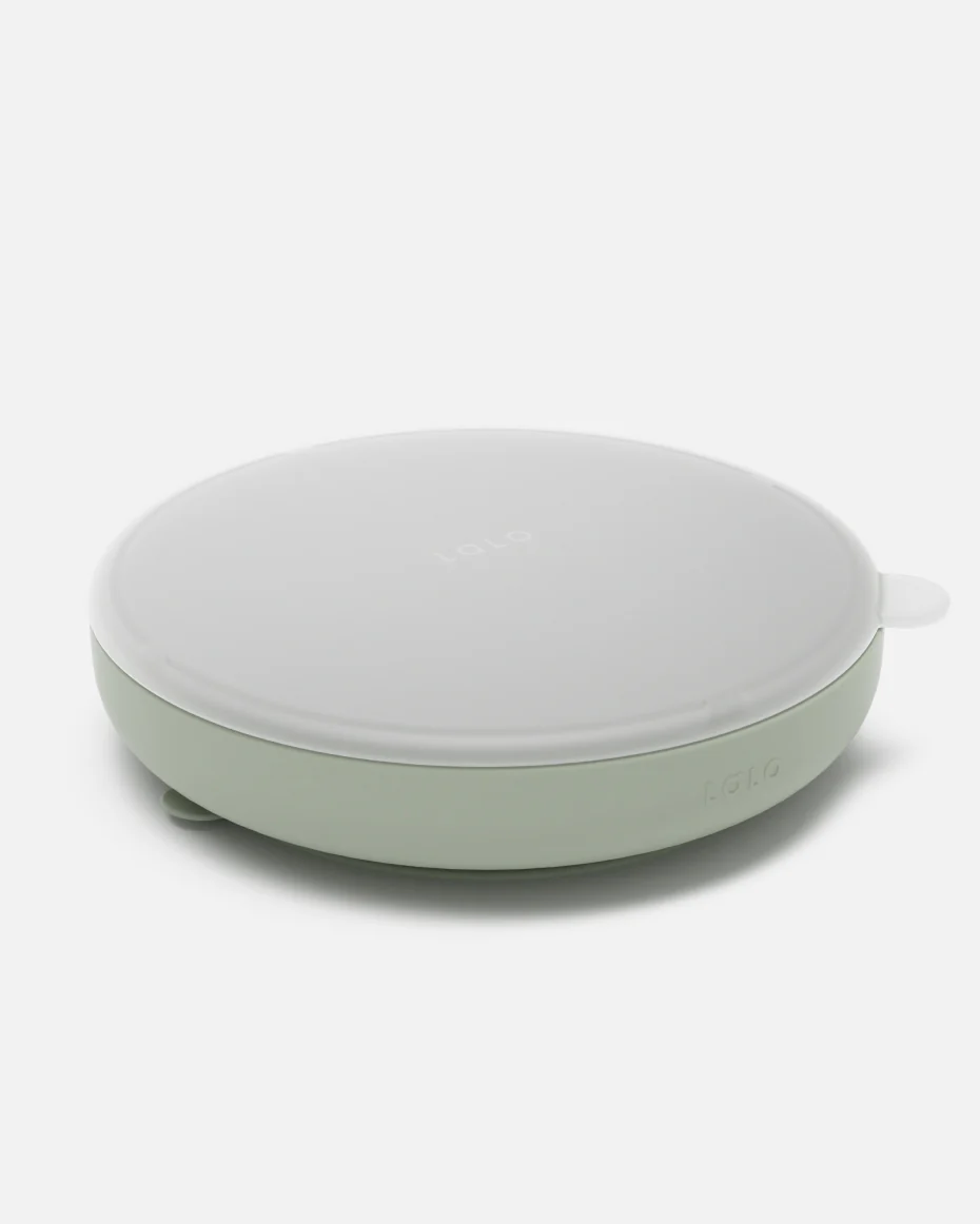 FDA grade non-toxic silicone, three divided sections and a suction base. When mealtime’s over, just pop on the lid to store leftovers hassle-free.